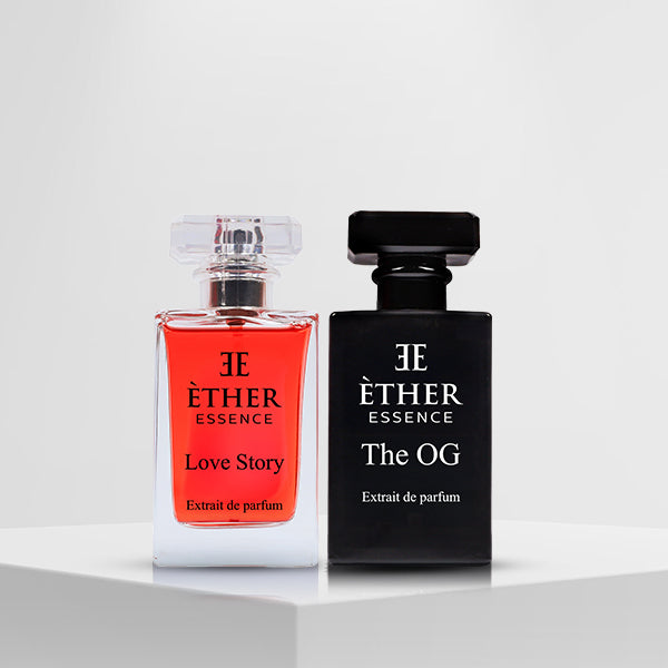 His bold confidence meets her soft elegance. The OG—leather and amber. Lovestory—floral, musky romance. Perfect for date nights or everyday synergy. Complimentary testers included.